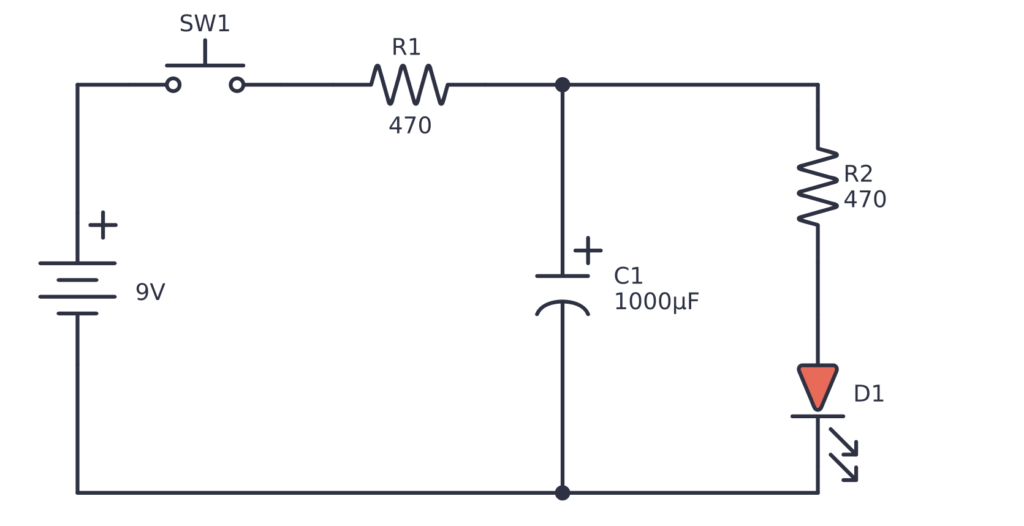 When you push the button, the capacitor starts to charge through resistor R1. As the capacitor charges, the LED will go from off to gradually turning on.
