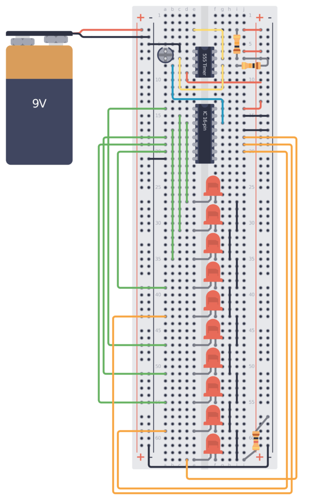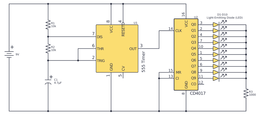 The 555 timer sets up a clock signal that decides of fast the LED should run across the lights. The decade counter counts each clock pulse and turns on the corresponding LED.