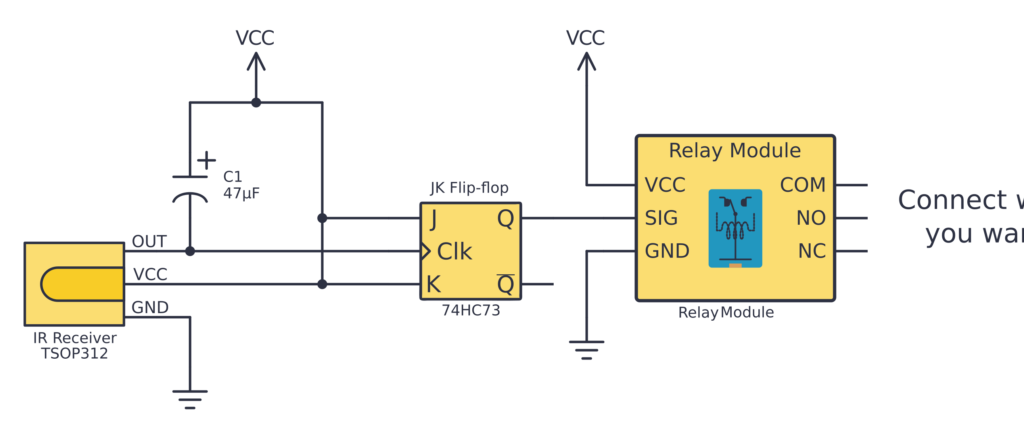 This project shows you how to create a simple remote-controlled on-off switch that will work with most IR remote controls. And you only need four components to build it—an IR receiver, a capacitor, a JK flip-flop, and a relay module.